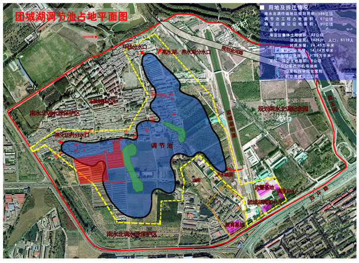 团城湖调节池最大调蓄容积 151 万方,近期实现调蓄容积为 127 万方。建设内容主要包括调节池及进水口、分水口、管理设施、武警基地、南水北调教育展示基地等。工程总投资约 30.4 亿元。