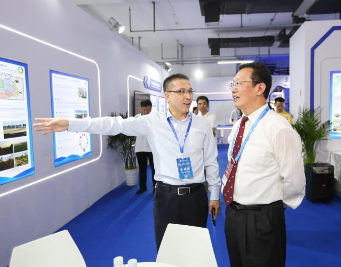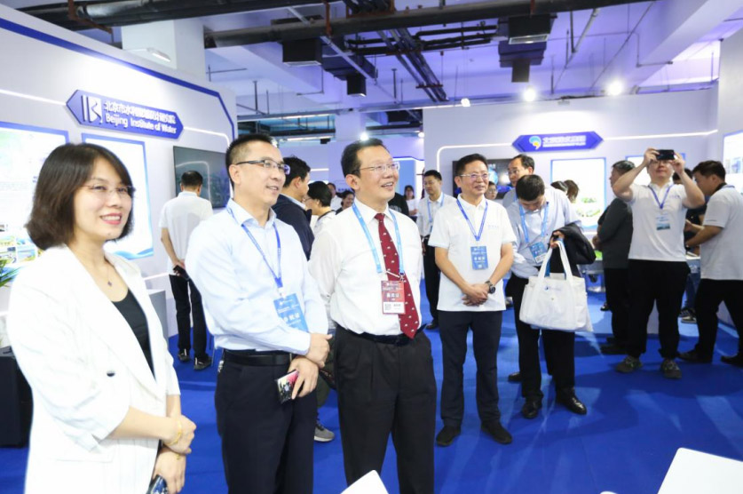 9月13日,水利部总规划师吴文庆参观北京水务展台,市水务局总规划师刘洪伟陪同介绍