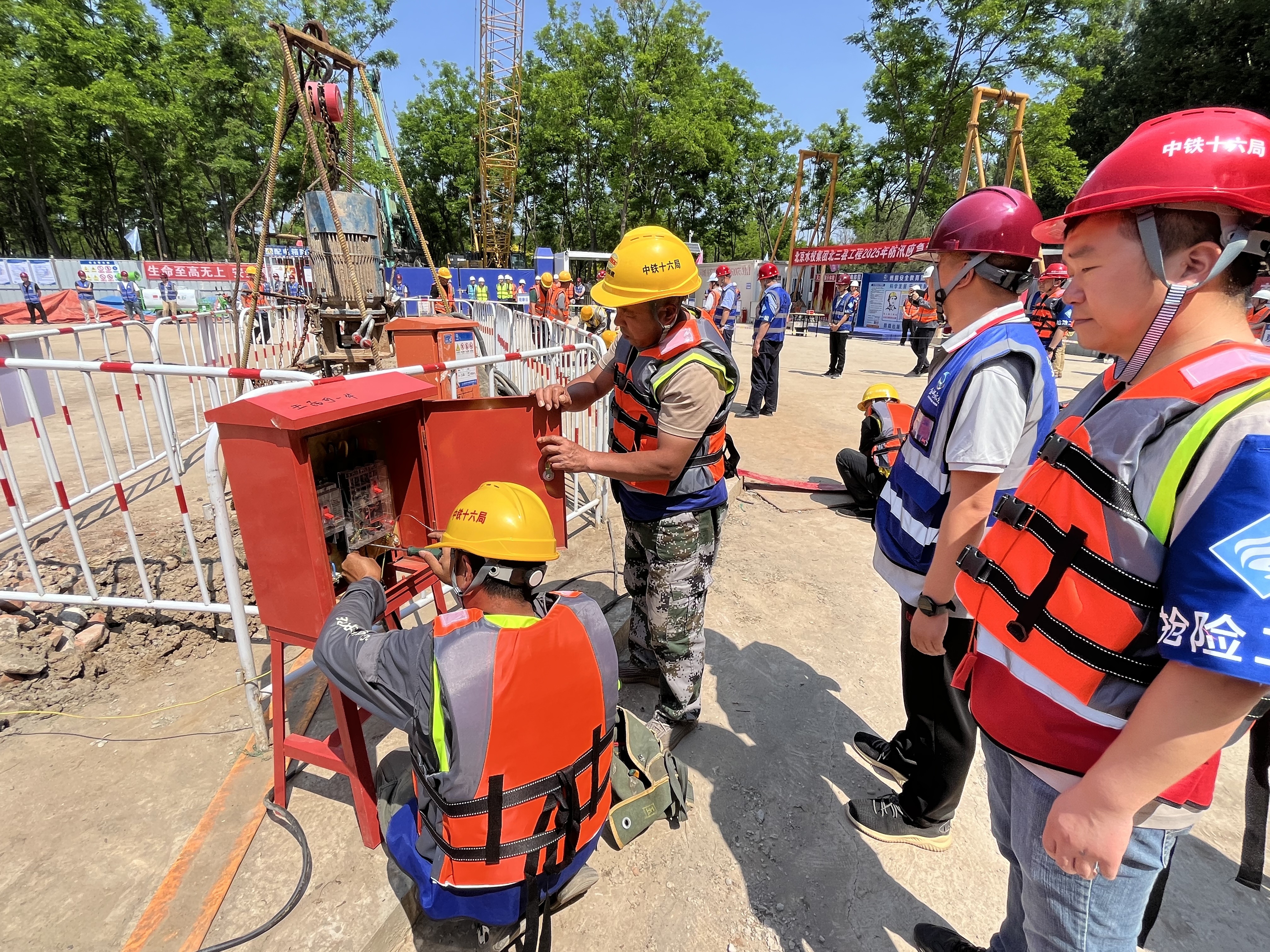 本次应急演练由集团“北三县”项目办牵头组织,各参建单位共同参与。演练严格按照《“北三县”工程2025年防汛应急演练方案》执行。演练中,总指挥史育斌现场指挥,副总指挥谢明利、现场指挥长白云庆有序部署,现场警戒组、抢险一组、抢险二组、后勤保障组、医疗救护组、通讯保障组、宣传组等各参建单位密切配合、分工明确,顺利完成竖井加高加固、井内抽水、警戒封控、后勤保障、应急救治等任务。整个抢险过程紧张有序、有条不紊。经过30分钟高效抢险,险情得以成功控制,演练圆满完成。